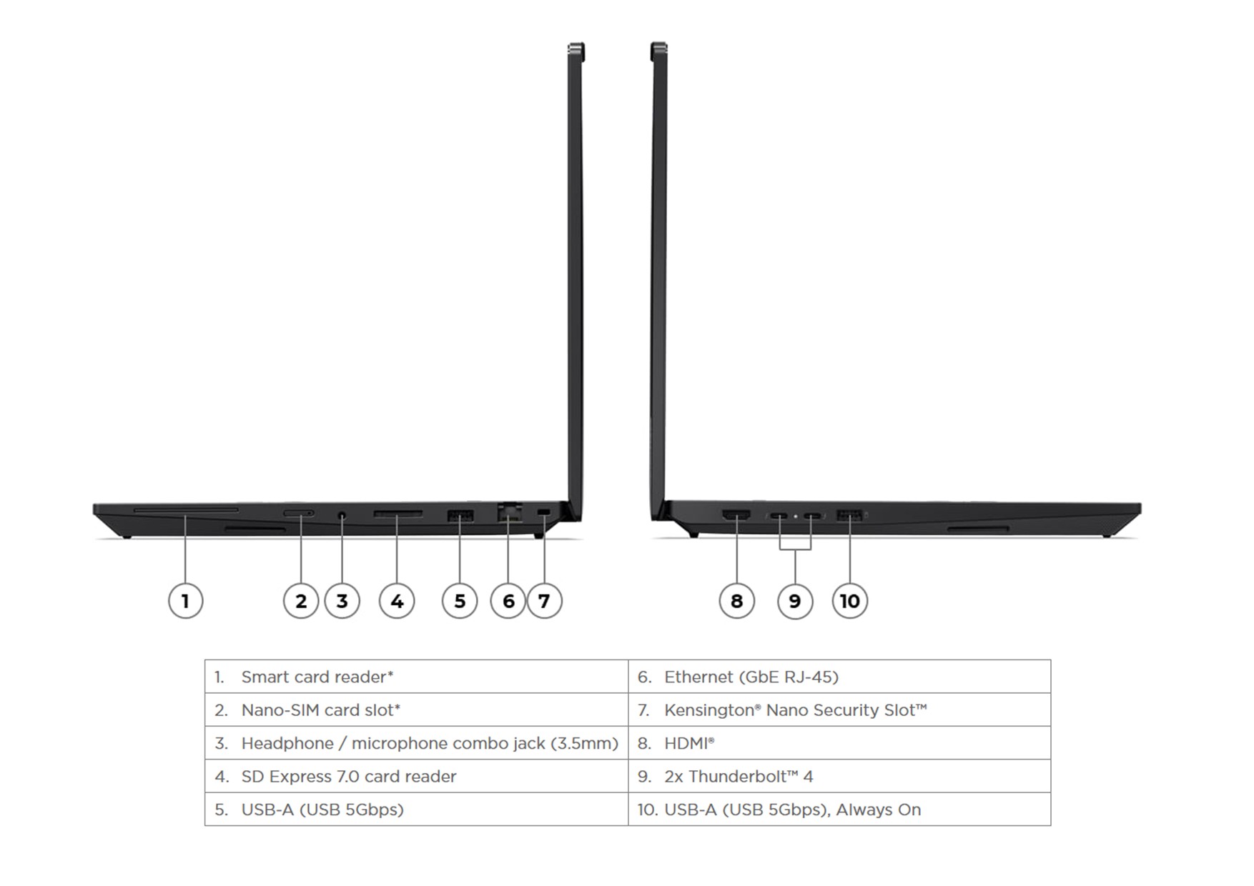 | Anschlüsse | 2x USB-C (40 GBit/s, Thunderbolt4 / USB4), gleichzeitig Stromanschluss, unterstützt DisplayPort 2.1, 2x USB-A (5 GBit/s, USB 3.2 Gen1) davon 1x mit Lademöglichkeit für Geräte mit USB-Ladeanschluss, während das Notebook ausgeschaltet ist), HDMI 2.1 (max. 4K/60 Hz), Mikrofon-/Kopfhörer-Kombianschluss (3.5 mm), Gbit-Ethernet (RJ-45) |